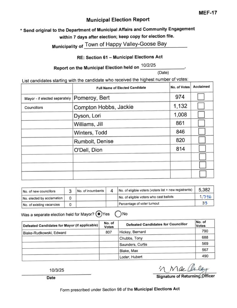 The Town of Happy Valley-Goose Bay is providing the Municipal Election Report for the October 2nd Municipal Elections at the Town of Happy Valley-Goose Bay.