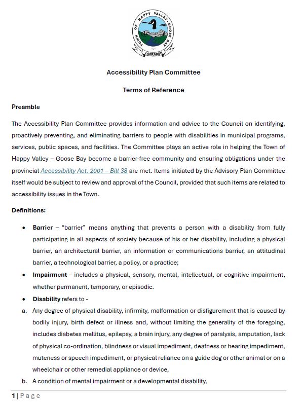 This section provides residents with access to all documents related to the Town of Happy Valley–Goose Bay’s Accessibility Plan. Here you will find important resources such as: