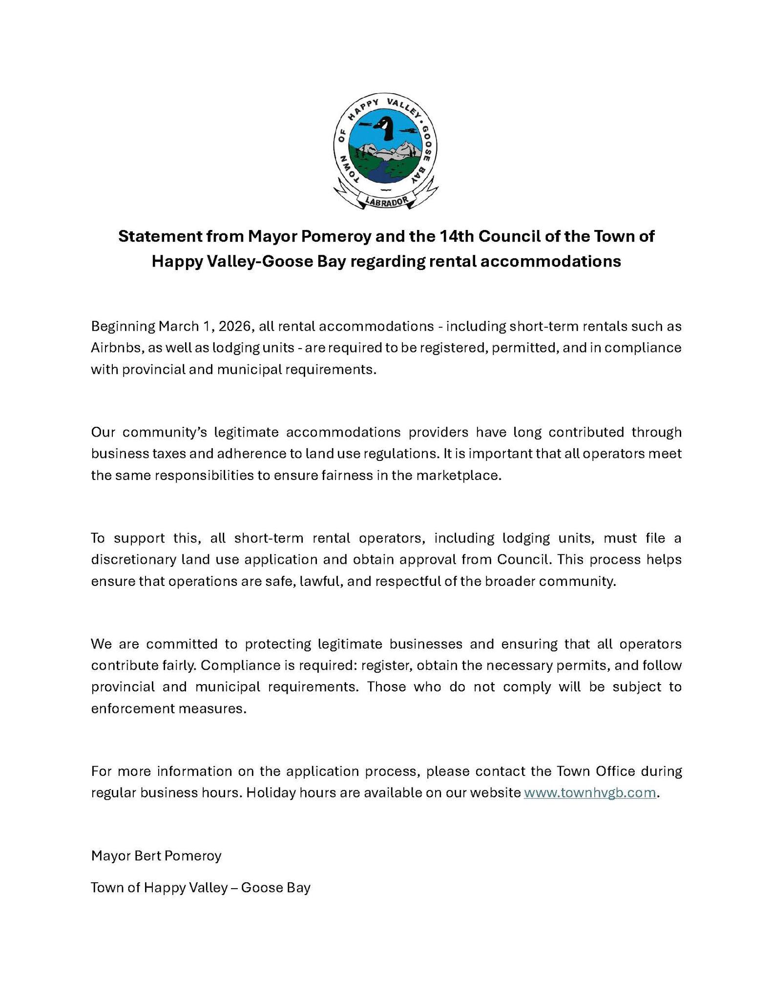 Statement from Mayor Pomeroy and the 14th Council of the Town of Happy Valley-Goose Bay regarding rental accommodations