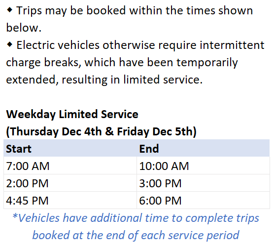 The Town of Happy Valley-Goose Bay would like to inform residents that charging and technical issues may occasionally put the bus out of service. As a result, booking times are subject to change, some booked rides may be cancelled, and the on-demand service will be unavailable during this period.